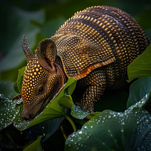 Gürteltier trinkt von einer mit Tau bedeckten Blatt