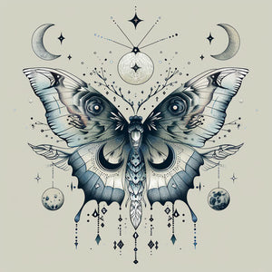 Mystische flache Tattoo-Skizze eines Schmetterlings mit Mondsymbolen auf seinen Flügeln, silberblauen und weißen Farben, Clipart-Stil