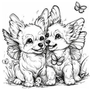Welpen mit Schmetterlingsflügeln im Stil von Jen Bartel Malbuchseite