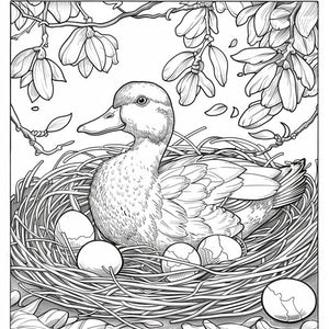 Eine Ente ruht friedlich in einem Nest mit Eiern. Malbuchseite
