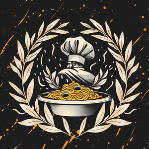 Italienisches Restaurantlogo mit Kochmütze auf ikonischem Gericht, umrahmt von Olivenzweigen.