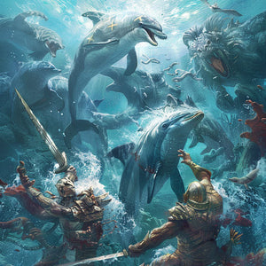 Epische Unterwasserschlacht mit Delfinen und mythischen Kreaturen