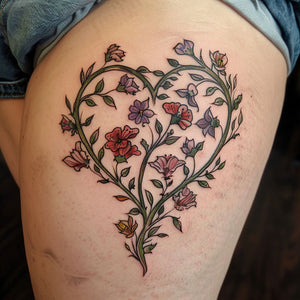 Wildblumenherz-Tattoo, verschlungene Stängel, leuchtendes Rot und Grün, romantischer Stil