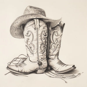 Boceto de un tatuaje de botas y sombrero de vaquero, tema rústico del Oeste americano, en un lienzo blanco liso.