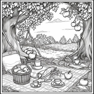 #Huerta #Manzana #Picnic #Colores #Dibujo #Naturaleza #Almuerzo #Página de colorear #Cesta #Manta