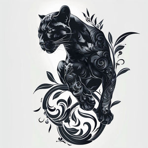 Tatuaje de pantera negra fluido y elegante inspirado en el modernismo en un fondo blanco ornamental.