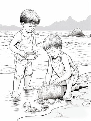 Niños jugando en la playa, páginas para colorear, ilustraciones detalladas