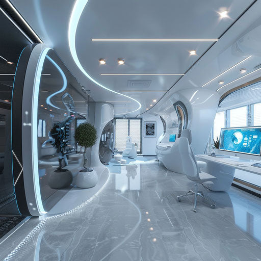 Oficina de una empresa fintech futurista con tecnología innovadora y decoración moderna