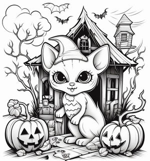Páginas para colorear de Halloween para niños con casa, accesorios y gato