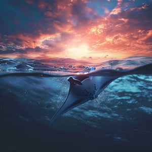 Raya manta nadando con gracia en el océano al atardecer