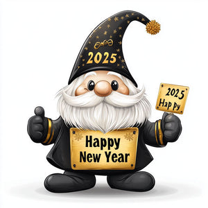 Año Nuevo Feliz 2025 con un gnomo lindo en negro y dorado