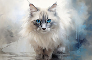 Gato claro mirando a cámara, estilo beige claro y azul oscuro