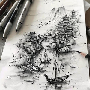 Boceto artístico de tatuaje plano de una orilla con un puente y barcos pintorescos