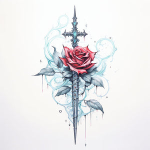 Rosa roja y daga con hojas, estilo acuamarina claro