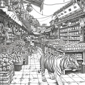 Escena detallada de mercado con un tigre deambulando, estilo de Stephen Wiltshire, página de libro para colorear