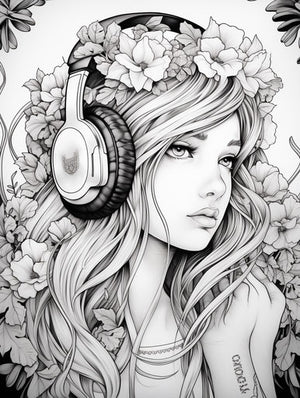 #fille fleur #casque audio #coloriage #manga cyberpunk #inspiration chicano #floral #arrondi #pictural #élaboré #3:4