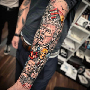 Tatouage avant-bras hommes satire politique, style S. Sack