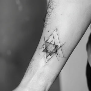 Art minimaliste de tatouage géométrique avec triangles et hexagones entrelacés