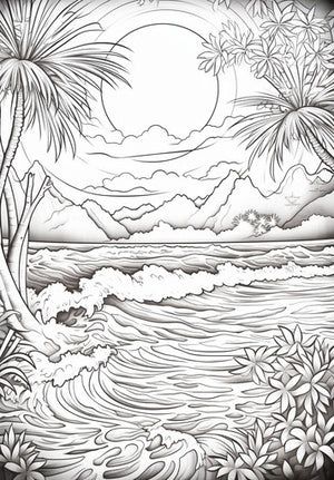 Plage avec vagues et palmiers coloriage, style paysages lumineux