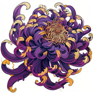 #tatouagejaponais #chrysanthème #illustrationgraphique #violetprofond #or #fondblanc