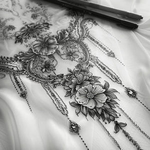 Esquisse de tatouage en dentelle vintage avec rideaux en dentelle et nappes anciennes comme inspiration