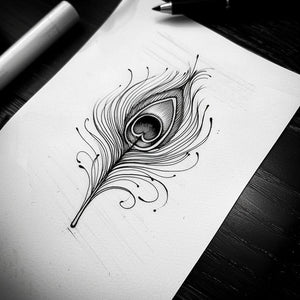 Esquisse de tatouage plume de paon simpliste en palette monochrome avec une touche moderne