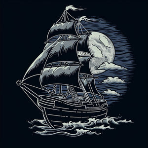Dessin de vintage d'un navire en silhouette bleu marine sombre