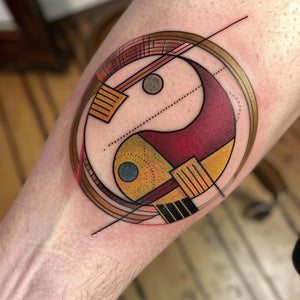 Tatouage yin et yang Art Déco aux formes géométriques audacieuses et couleurs métalliques sur fond blanc