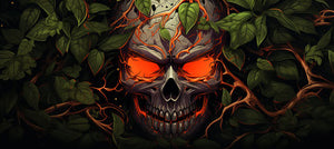#koponya #levelek #dühösarc #pirosSzemek #grafikusTervezés #fénnyelHatással #ezüstésnarancssárga #mechanikaiTervezés #feketeVonások #angelcore