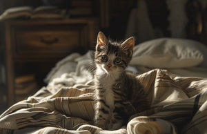 Kiscica ül az ágyon sötétbarna és fehér stílusban