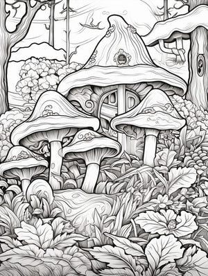 Felnőtteknek szóló színező lap virágokkal és gombákkal a mezőn