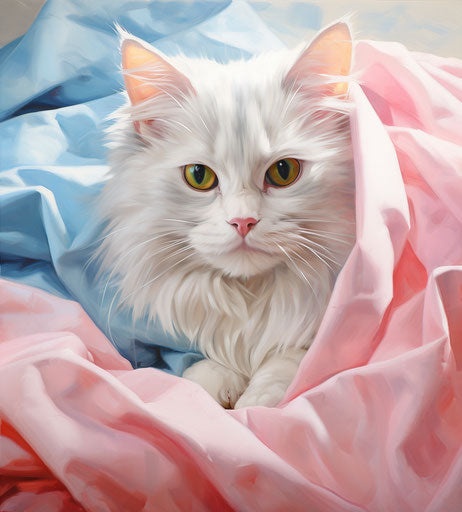 Rózsaszín és fehér cica ül a takarón nagy kék szemmel