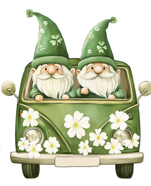 Szent Patrik nap törpék vezetnek a zöld furgonnal fehér virágokkal