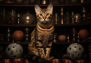 Bengáli macska ül polcokon és felfelé néz