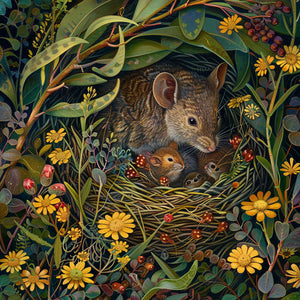 An antechinus and her young in a cozy nest hidden under a bush in a vibrant meadow