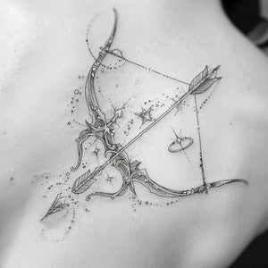 Sketch of bow and arrow tattoo with cosmic theme