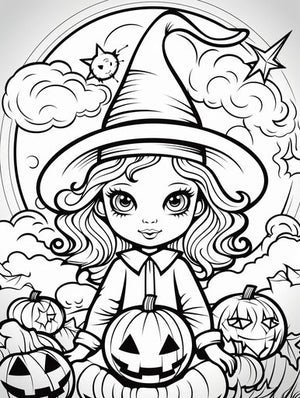 Halloween coloring pages for kids happy Halloween, in the style of witchy academia, caricature faces
