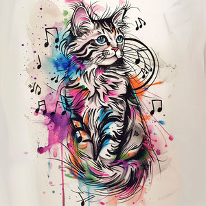 Dynamic sketch of a tattooed cat surrounded by musical notes
