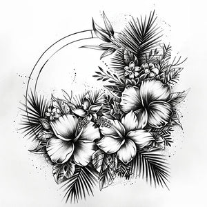 Vibrant tattoo sketch of circle with burst of tropical flowers