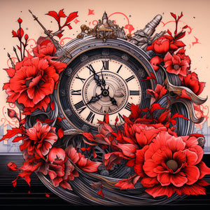 #clock design #flowers #neo-traditional japanese style #stipple #light black #red #detailed feather rendering #frogcore #goosepunk #sharpness