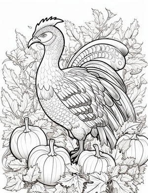 Printable Thanksgiving turkey coloring pages, toy camera style, birds-eye-view, strong facial expression, ottoman art, tender nature depiction