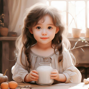 A beautiful little girl sitting at a table with milk