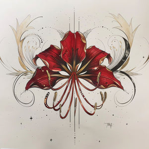 Art deco inspired tattoo sketch of a red spider lily with symmetrical designs and metallic gold accents