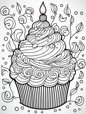 Coloring page: happy birthday cupcake, artistic style