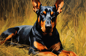 The doberman sits in the grass, light orange and dark black style, masculine 17:11