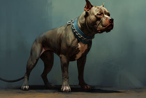 A large pit bull with a leash, dark cyan and dark brown style, dark gray, princesscore, ilford xp2, hard-edged lines, HD mod, lighthearted 34:23