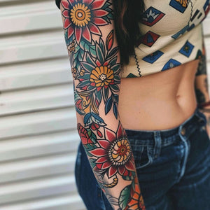 Colorful sleeve tattoos for women with traditional American themes