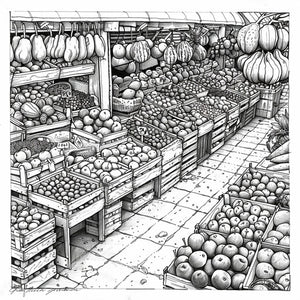#fruit market #bustling scene #coloring book #Stephen Wiltshire #busy activity #fresh fruits #outdoor market #kids entertainment #local trade #artistic decoration