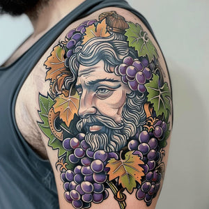 Vibrant and colorful tattoo of Dionysus with grapes and wine
