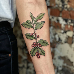 #Tattoo #Coffee #Plant #Berries #ColorPalette #Green #Brown #Elegant #Sketch #BodyArt
